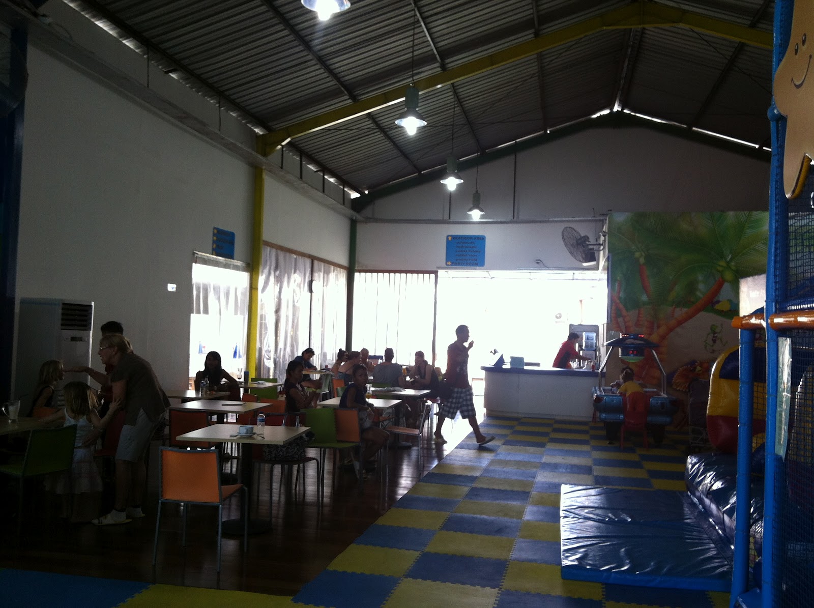 The cafe is located inside, so it is possible to kind of keep an eye on the children as they fool around. They have a selection of drinks - coffee, shakes, juices - and also a quite extensive food menu with Indonesian favorites and western options available as well. prices range from 8.5k for a bottle of water and the food around 30k.